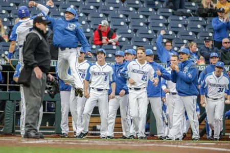 Creighton celebrates its first run of the game on Tuesday